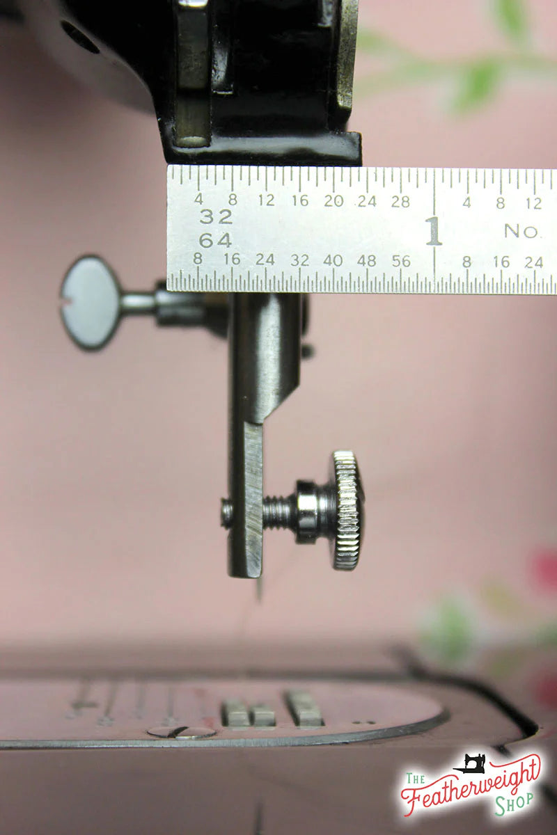 The width of the machine area under the presser bar lifter varies slightly on a 221 compared to a 222. The 221 measures 21/32nd inch.
