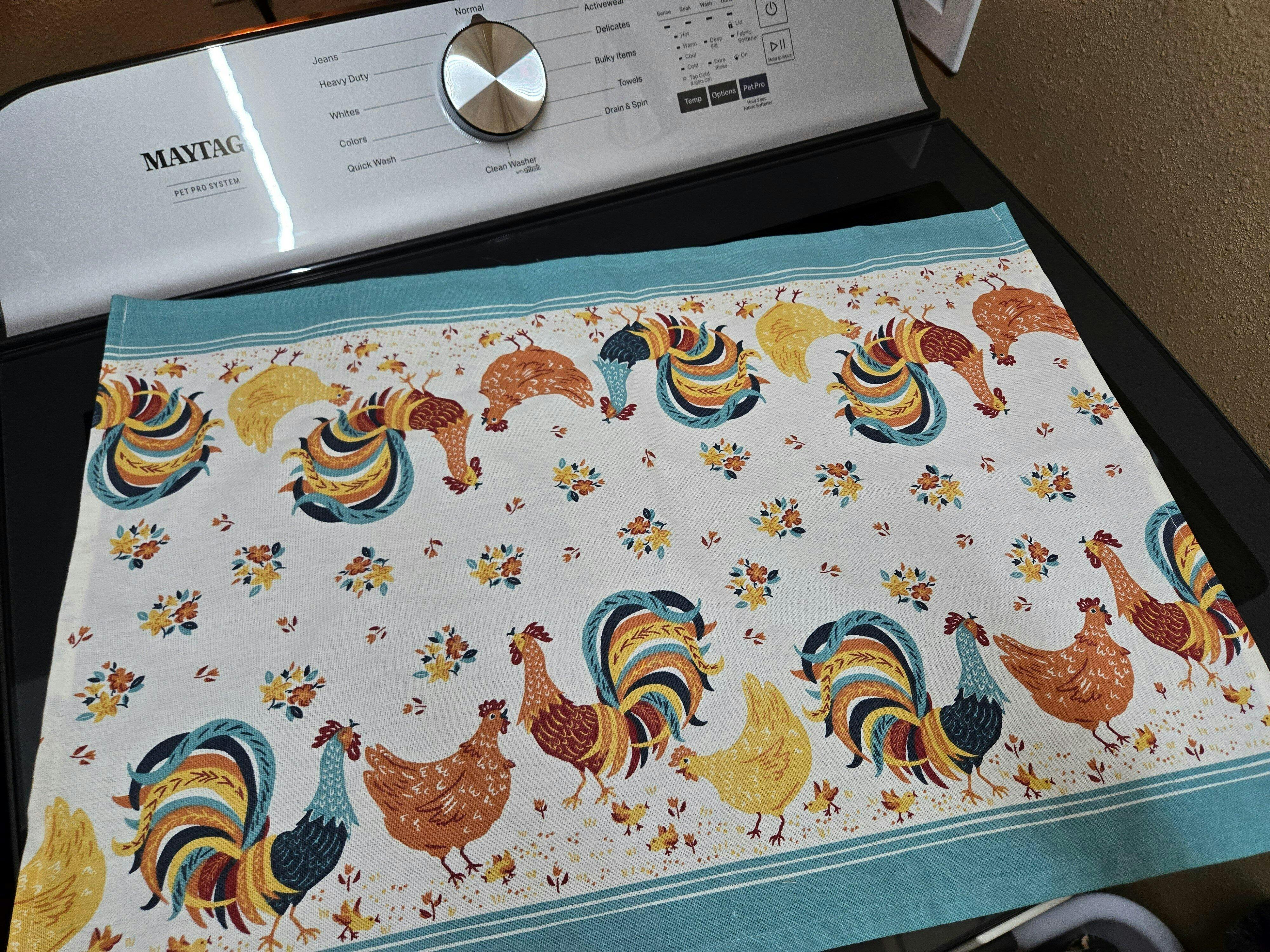 Old Fashion Toweling. Make kitchen towels, curtains, pillows, or apron. All toweling fabric is 16" wide, 100% cotton and machine washable. Hemmed on the sides. This print features a various rooster and hen repeating pattern of chickens.